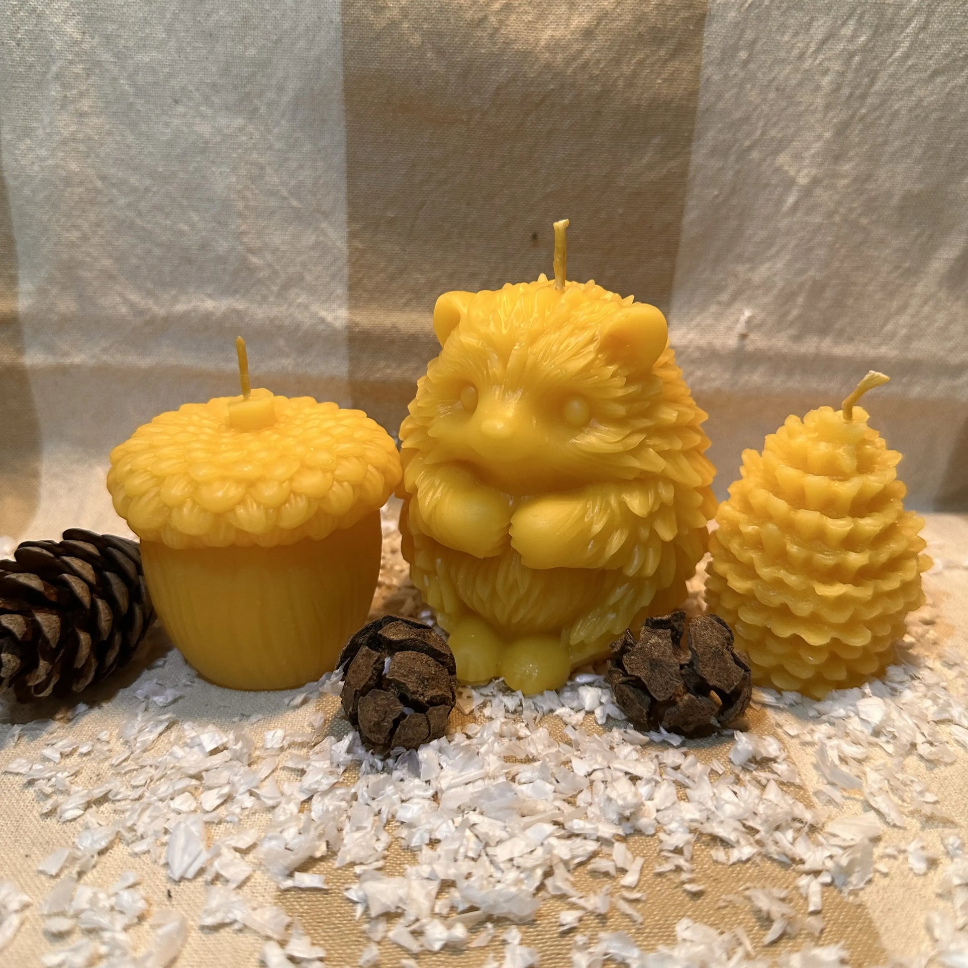 Drei liebevoll gestaltete Bienenwachskerzen – Eichellicht, Igelchen und Zapfenzauber – erinnern an Spaziergänge im Herbstwald, den Duft von Laub und das goldene Licht der Natur.